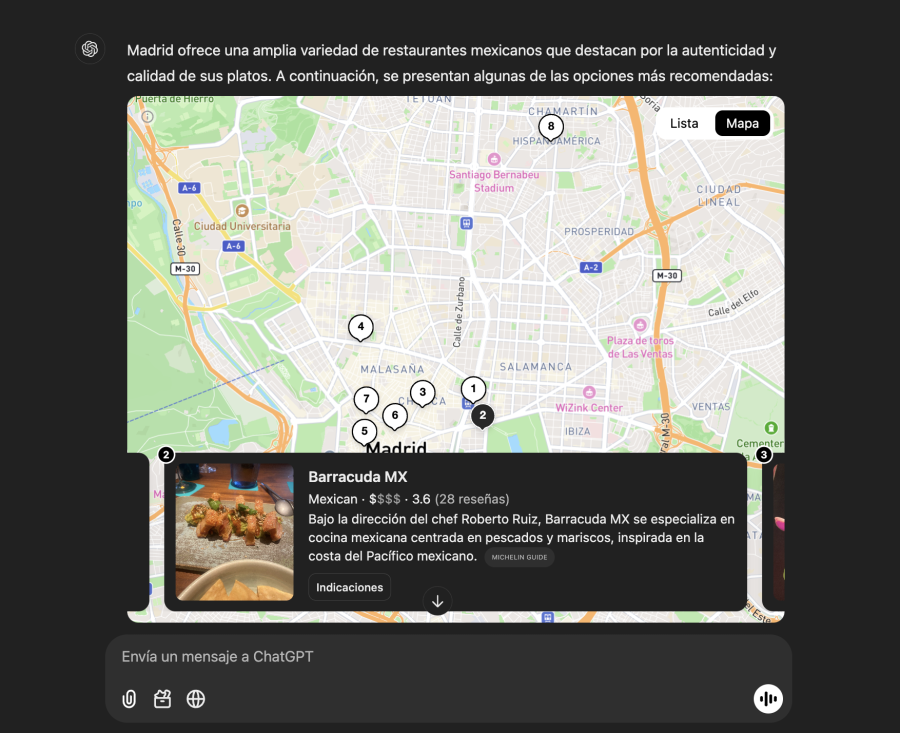No debemos olvidar los motores de búsqueda conversacionales. ChatGPT, Perplexity, Gemini o Grok son algunos de ellos. Estos motores, también ofrecen resultados locales y este año auguramos que muchos más usuarios harán uso de estas herramientas para realizar búsquedas locales. No analizar cómo aparece tu empresa al realizar búsquedas locales conversacionales y potenciar su visibilidad. Algunas empresas como ChatGPT para construir sus rankings locales y resultados, usan fuentes como webs oficiales de las empresas, plataformas como Google Maps, TripAdvisor y otras sectoriales, guías y artículos especializados, etc.