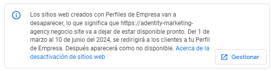 Ahora bien, ¿esto será así de forma permanente? No. Esta mano amiga de Google tiene fecha de caducidad. Ten presente que esta tarea será realizada por un tiempo limitado: tus sitios web redirigirán a los clientes a tus Perfiles de Empresa sólo hasta el 10 de junio de 2024. Después de esa fecha, aparecerán como no disponibles, la conocida como «Página no encontrada».