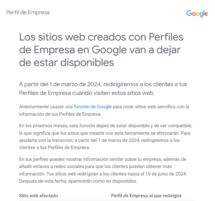 Es probable que hayas recibido recientemente un correo electrónico de Google con el asunto: «Información importante sobre los sitios web creados con Perfiles de Empresa en Google». Este mensaje es especialmente relevante para ti y no deberías pasarlo por alto.