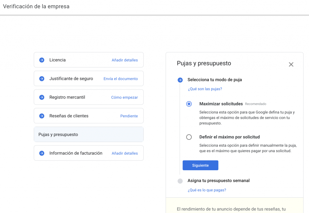 En este paso, Google nos pide elegir entre dos opciones. Maximizar solicitudes, es decir que Google defina la puja de forma autónoma o definir el máximo por solicitud, es decir que seamos nosotros quienes seleccionemos manualmente la puja.