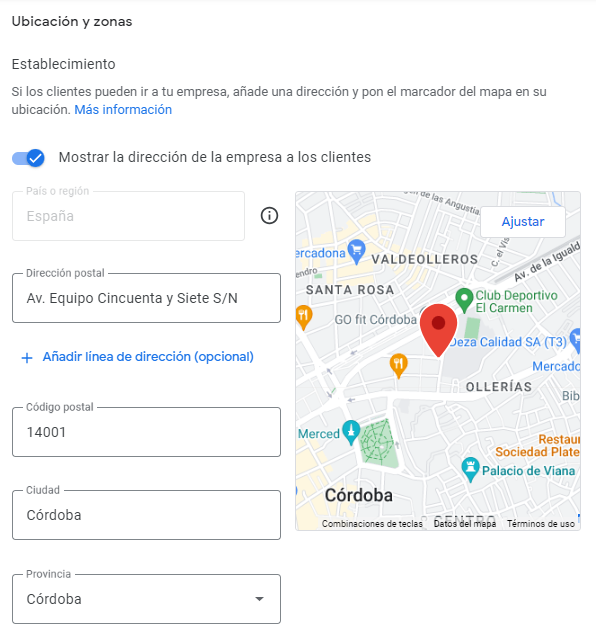 Aquí podrás modificar la dirección postal del negocio.