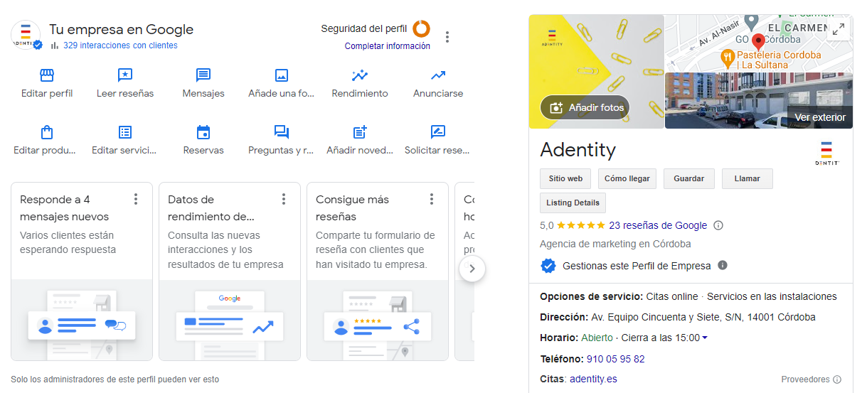 Lo primero que debes tener en cuenta es que para modificar tu dirección o cualquier otro dato de tu Perfil de Empresa en Google, tienes que ser administrador del perfil. De lo contrario, no tendrás acceso al panel de gestión.