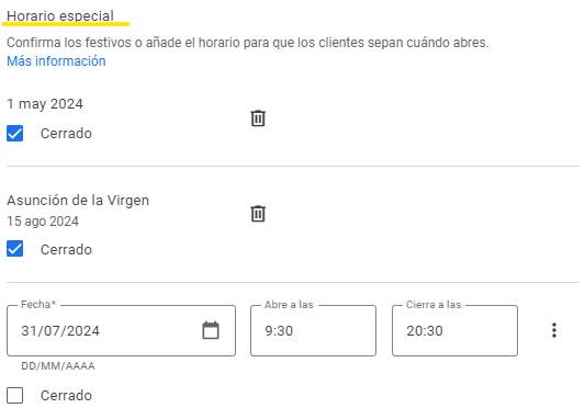 Sin embargo, deberás seleccionar la opción de «Horario especial», justo debajo de la opción «Horario». Aquí podrás establecer horarios específicos para días festivos o periodos de cierre. Selecciona la fecha y ajusta el horario según sea necesario.