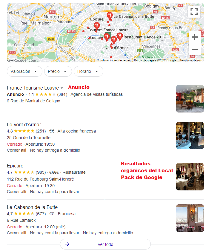 Además, cuando se trata de empresas con presencia local, lo que más se busca lógicamente es estar en las tres primeras posiciones de lo que conocemos como el Local Pack de Google:
