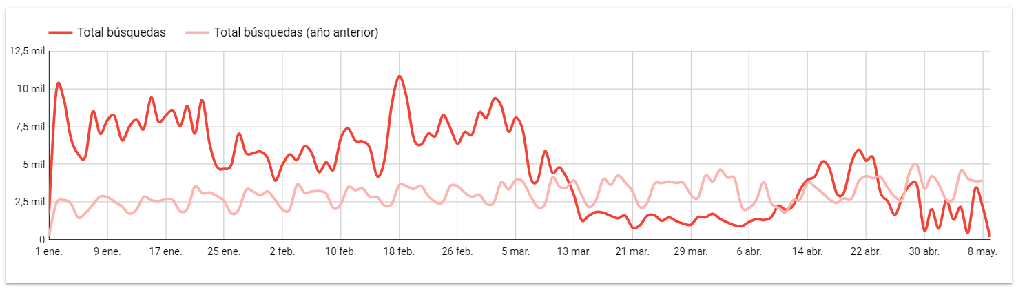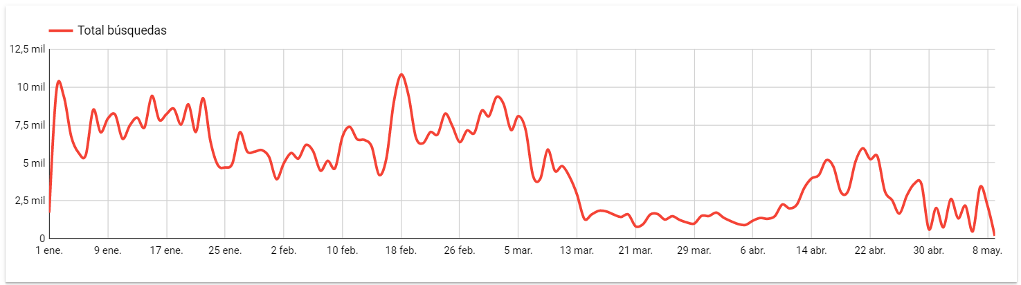 Podemos ver que lo «normal» sería que los niveles se mantuvieran, que la tendencia fuera similar mes a mes. Pero desde mediados de marzo hasta mediados de abril la caída ha sido muy significativa. El repunte es bajo y coincide con las noticias sobre la vuelta a la normalidad, autorización para abrir más empresas y permisos para poder salir, entre otras.
