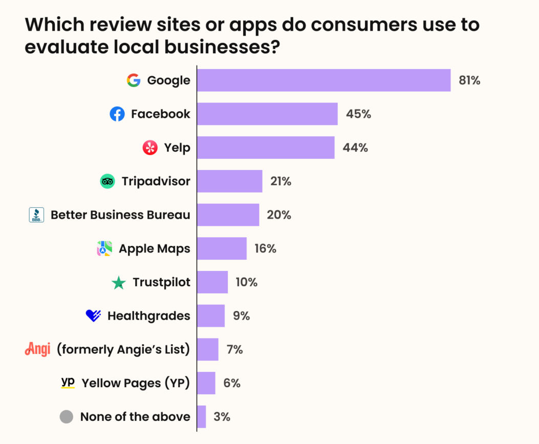 Google sigue siendo, con mucho margen, la plataforma más utilizada para buscar reseñas online. El 81% de los encuestados de EEUU la usan, seguidos de Facebook  (45%) y Yelp (44%)