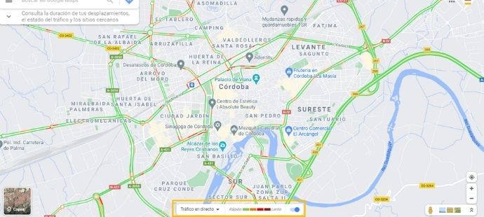 Además podrás activar en Google Maps la opción de ver el tráfico que hay en tu ciudad para escoger la ruta más rápida o que mejor se adapte a tus necesidades. Donde los colores marcados en la foto del mapa de Google te dirán que cantidad de tráfico hay para cada ruta.