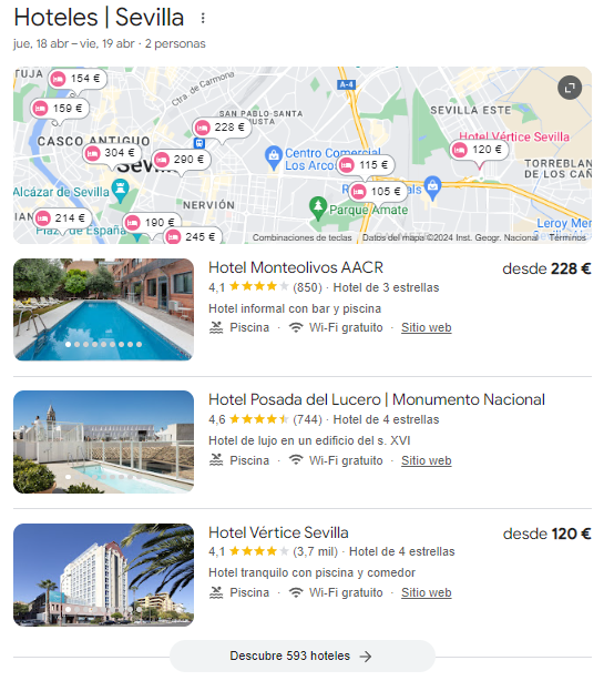 Tal y como podemos observar, el resultado muestra 3 hoteles destacados, los cuales tienen un buen posicionamiento por la Keyword (Hoteles con piscina en Sevilla). Además, el resultado también nos presenta un mapa con muchos otros hoteles con piscina repartidos por la ciudad sevillana, permitiéndonos incluso ampliar nuestras opciones a otros hoteles (Descubre los 121 hoteles).