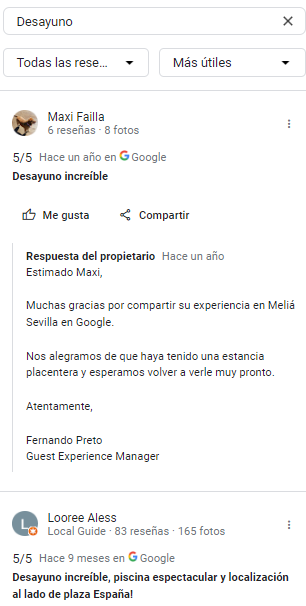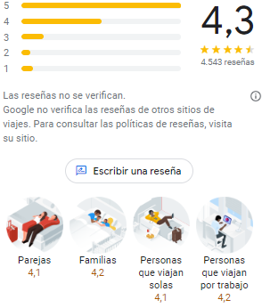 Las reseñas de hoteles tienen un impacto distinto en comparación con las valoraciones de otros tipos de negocios. Google reconoce su relevancia al destacarlas en los perfiles, captando así la atención de potenciales clientes. Al realizar la búsqueda de reseñas de un determinado hotel, el usuario puede elegir qué tipo de reseñas desea leer, si todas, o sólo las de Google u otras plataformas como Tripadvisor.