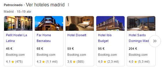 Hotel Ads, es una plataforma de publicidad de pago de Google específicamente diseñada para el sector hotelero, la cual muestra precios dinámicos que varían según la demanda y otros factores. Cuando un viajero realiza la búsqueda de hoteles en Google, la mayoría de las veces los resultados mostrarán en primer lugar los hoteles marcados con la insignia de patrocinados.