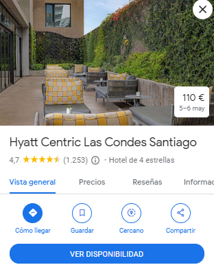 Si bien es cierto que es posible definir un horario de apertura internamente en tu Perfil de Hotel, es importante tener en cuenta que esta información no se muestra al usuario externo que realiza la búsqueda en Google. Esto se debe a que los hoteles operan las 24 horas del día, lo que significa que no tienen un horario de apertura convencional frente a los otros comercios tradicionales. Si realizamos una breve búsqueda de un hotel, podemos ver cómo es sólo la dirección la información que nos ofrece el Perfil en este caso.