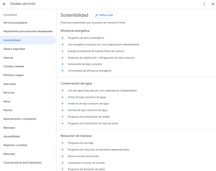 Para añadir las prácticas de sostenibilidad de tu hotel en Google Business Profile, debes seguir estos pasos: Accede a tu Perfil de Empresa en Google y elige la opción para editar la información del hotel. Luego, selecciona la sección «Sostenibilidad» y elige entre las categorías de eficiencia energética, ahorro de agua, reducción de residuos y abastecimiento sostenible. Si deseas saber más sobre este tema, te recomendamos esta pequeña guía.