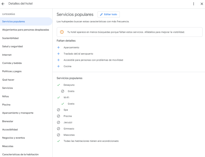 No obstante, cabe recordar que a veces algunos atributos han sido añadidos de forma instantánea a nuestro Perfil de Hotel. Esto se debe a que Google recoge información de diferentes fuentes para otorgar esos atributos. En caso de que estos sean incorrectos, puedes ponerte en contacto con el equipo de soporte de Google para que te ayude con tu problema.