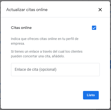 Por último, la actualización más reciente tiene que ver con las Citas Online con los clientes. Si ofrecemos atención por videoconferencia, tenemos la opción de indicarlo en nuestra ficha de Google My Business. Además, si en nuestro sitio web tenemos disponible un apartado donde los clientes puedan concertar esta cita, lo podremos añadir para ponérselo más fácil.