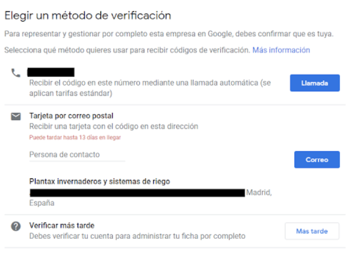 Finalmente tendremos que completar el proceso de verificación de la empresa a través de las opciones disponibles: correo postal, teléfono o correo electrónico.