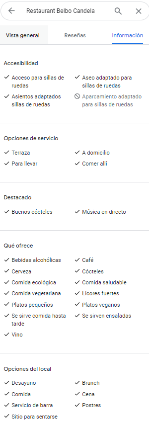 Estos atributos no están disponibles en todas las categorías; por ejemplo, las empresas de marketing no cuentan con ellos, mientras que los restaurantes sí. Si buscas el negocio en Google Maps y seleccionas para ver más información, podrás encontrarlos: