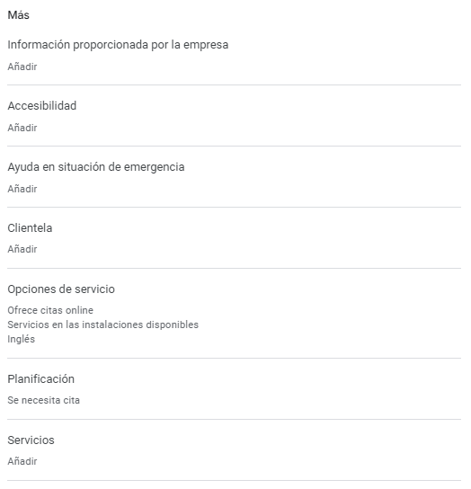 - Selecciona la información que deseas cambiar o añadir por primera vez. Entre los atributos que encontrarás están: Información proporcionada por la empresa, Accesibilidad, Ayuda en situación de emergencia, Clientela, Opciones de servicio, Planificación y por último, los Servicios.
