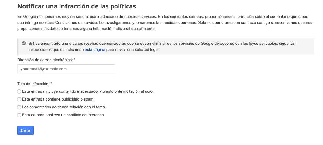 Pour la faire courtem la réponse est non. Signaler une critique négative ou destructrice ne signifie pas que Google va la supprimer. En fait, peu de commentaires sont marqués comme inappropriés et sont supprimés par Google. Néanmoins, cela vaut la peine d’essayer, car nous ne perdons rien. D’un autre côté, la rumeur court (que nous démentissons d’ici) qu’il y a plus de chances qu’une critique soit supprimée si nous la rapportons plusieurs fois ou avec beaucoup de comptes. C’est faux, car ce que nous allons faire c’est dupliquer le même rapport et ça ne fera que nous faire perdre notre temps.