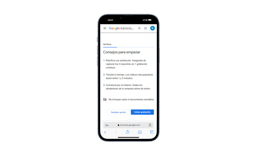 En la verificación por vídeo tendrás que grabar in situ. En los últimos años, Google ha intensificado el uso de la verificación por video como medida contra perfiles falsos o duplicados, especialmente para negocios en sectores vulnerables (servicios técnicos, profesiones reguladas). El vídeo que presentes debe ser una única toma continua y sin cortes, y la revisión por parte de Google suele durar hasta 5 días laborales.